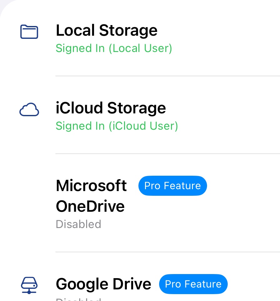Store in your device, iCloud, or connect Google Drive/OneDrive. Your choice, your control.